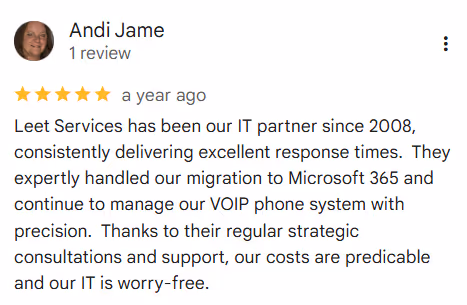 Leet services are the best. They are 100% responsive, very professional and are always able to assist me in meeting my needs. I highly recommend their services. We use them for our small business of around 50 staff. They provide IT support and emergency support as needed.